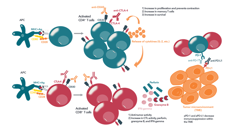Figure. 1 Anti-OX40 in combination with aCTLA-4 or aPD-1/aPD-L1 enhances T cell proliferation, survival, and effector function while decreasing immunosuppression within the tumor microenvironment.