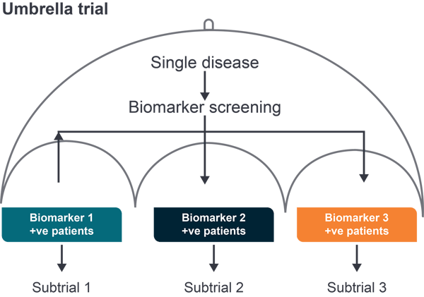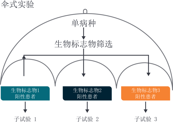 与篮式试验不同,伞式试验专注于某一特定类型的癌症,但基于特定的基因突变或改变,测试多种治疗方案。