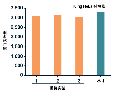 图、在 200ng HeLa 裂解液的 120 分钟单针实验中,可鉴定超过 7,500 个蛋白,并且三次实验共同定量了 6,974 个蛋白,数据完整性高达 96%;而在常规蛋白质组学中,通常需要 µg 级的样品来检测约 5,000 个蛋白。