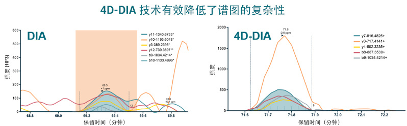 4D 技术代表性的离子淌度分离,提供了额外维度的校准信息。能够更准确从 DIA 的混合谱图中鉴别出具体的肽段信号,有效降低了谱图的复杂性,全面提升了 DIA 检测的准确性和可靠性。