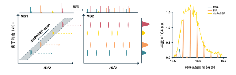 对于没有结合离子淌度分离的传统 DIA,最大的挑战就在于其混合谱图难以可靠解析。在定量过程中,主要依据色谱洗脱时间(保留时间)来进行匹配。但是,由于共洗脱现象的普遍存在,仅仅依靠色谱洗脱时间是不够的,存在很多的干扰信号,而影响了检测结果的准确性。